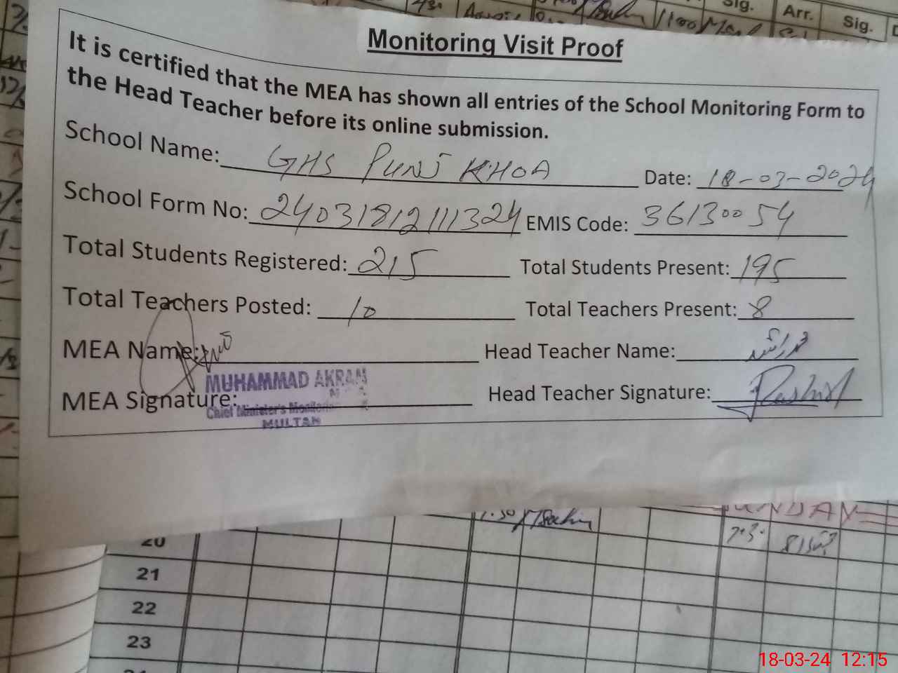 | Attendance Register | Head Teacher | MEA with School | Visit Proof |