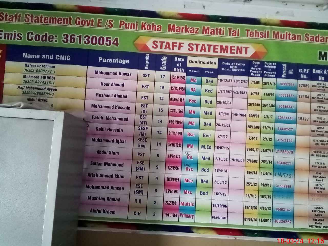 | EMIS Code: 36130054 | Name of School: GHS PUNJ KOHA MULTAN | |||