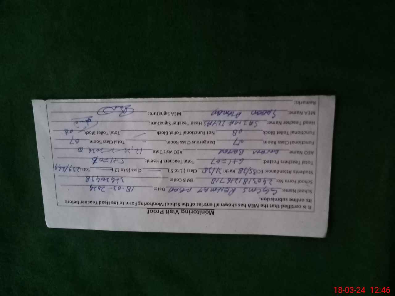 | Certified that this School was Inspected by the Undersigned MEA/DMO Today and the Information Stated Above is as Per Record. | |||||