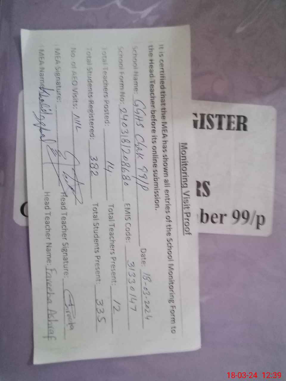 | EMIS Code: 31330147 | Name of School: GGHS CHAK NO. 99/P | |||