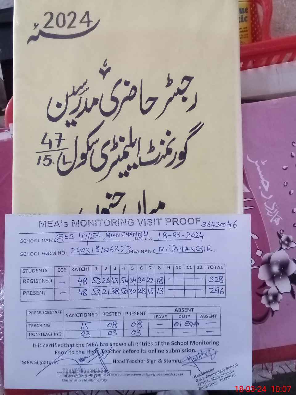 | EMIS Code: 36430046 | Name of School: GES 47/15-L, P/O 124/15-L, MIAN CHANNU | |||