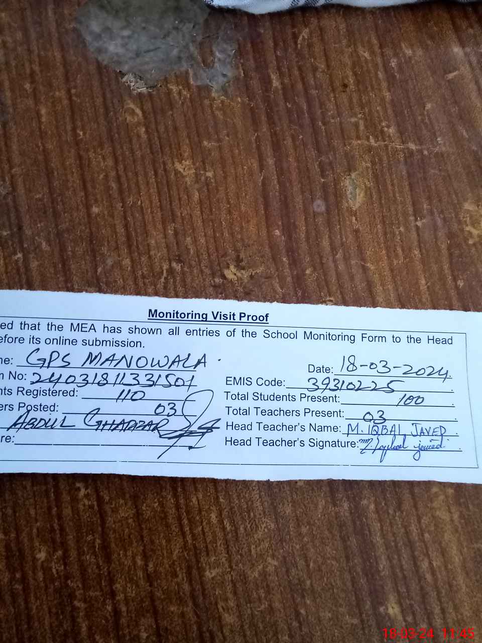| Attendance Register | Head Teacher | MEA with School | Visit Proof |