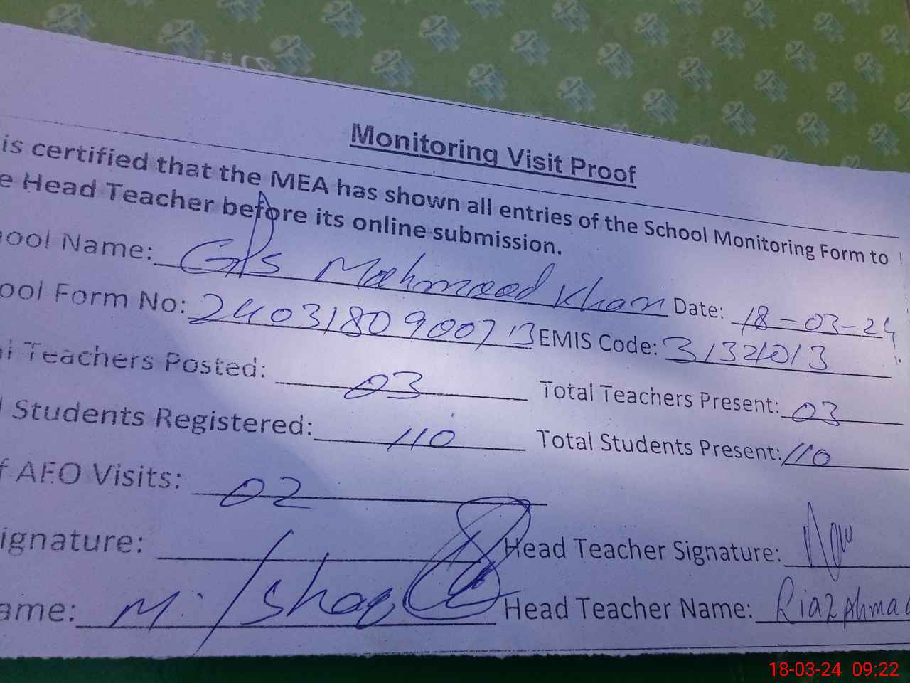 | Attendance Register | Head Teacher | MEA with School | Visit Proof |