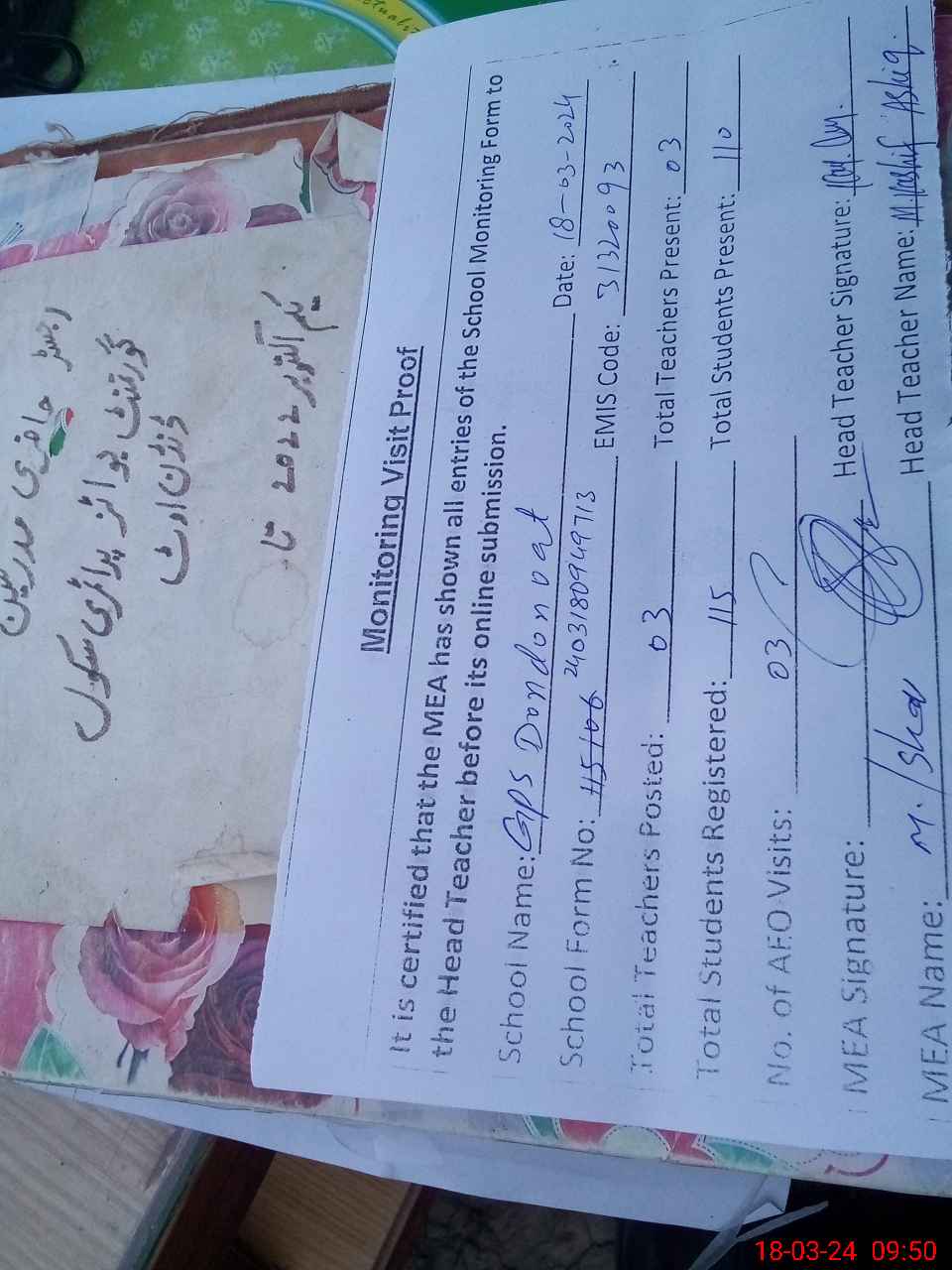 | Attendance Register | Head Teacher | MEA with School | Visit Proof |