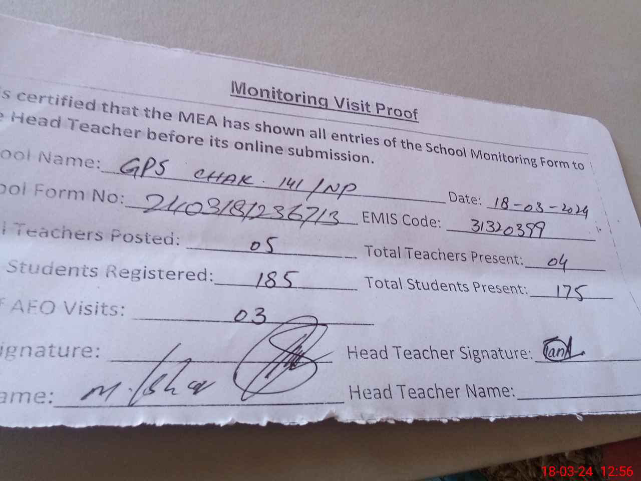 | Attendance Register | Head Teacher | MEA with School | Visit Proof |