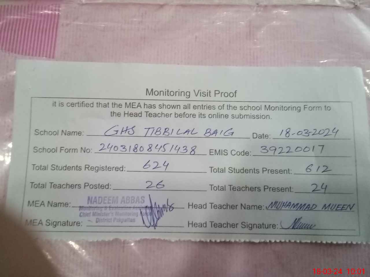 | Certified that this School was Inspected by the Undersigned MEA/DMO Today and the Information Stated Above is as Per Record. | |||||