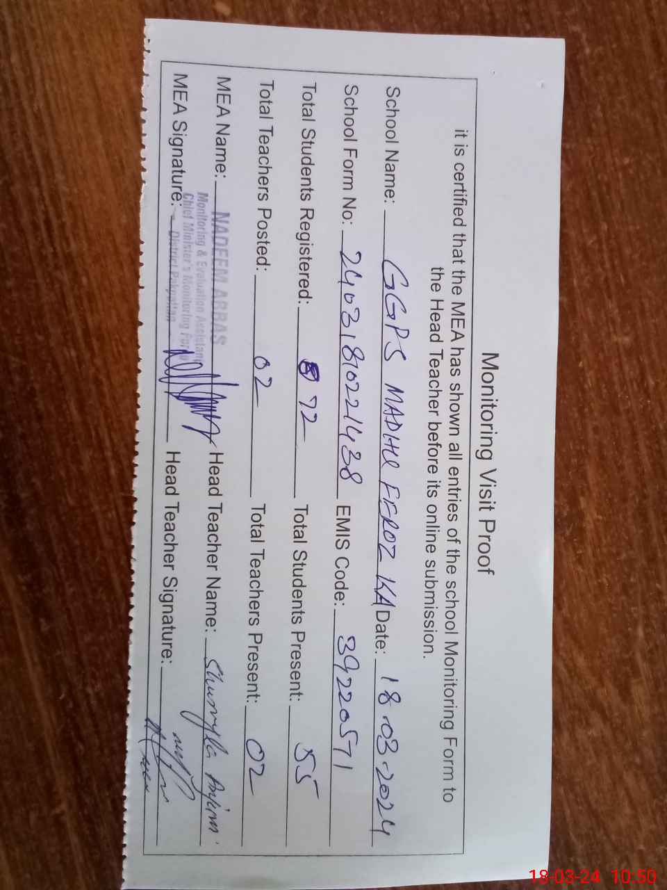 | Attendance Register | Head Teacher | MEA with School | Visit Proof |