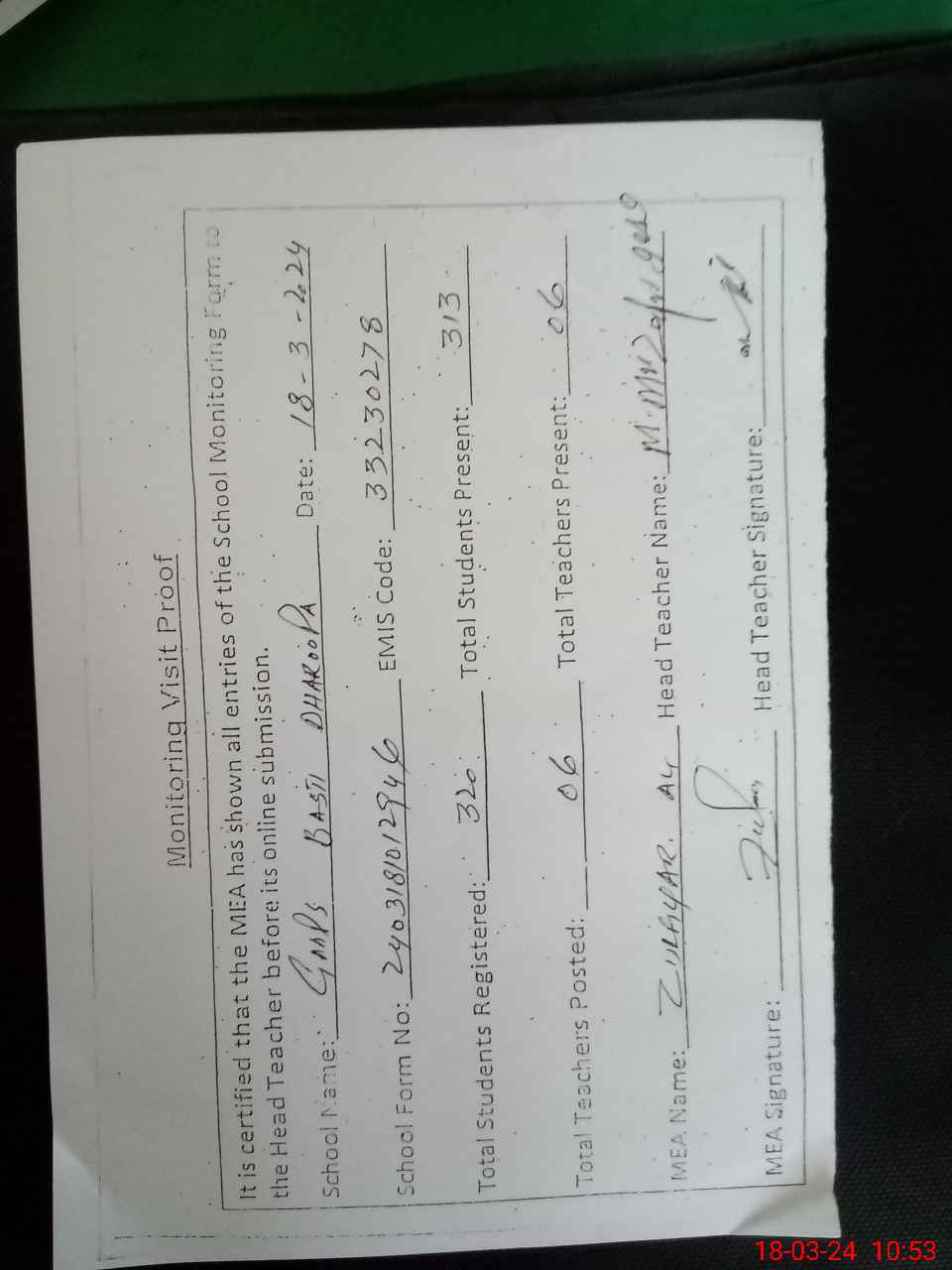 | Attendance Register | Head Teacher | MEA with School | Visit Proof |