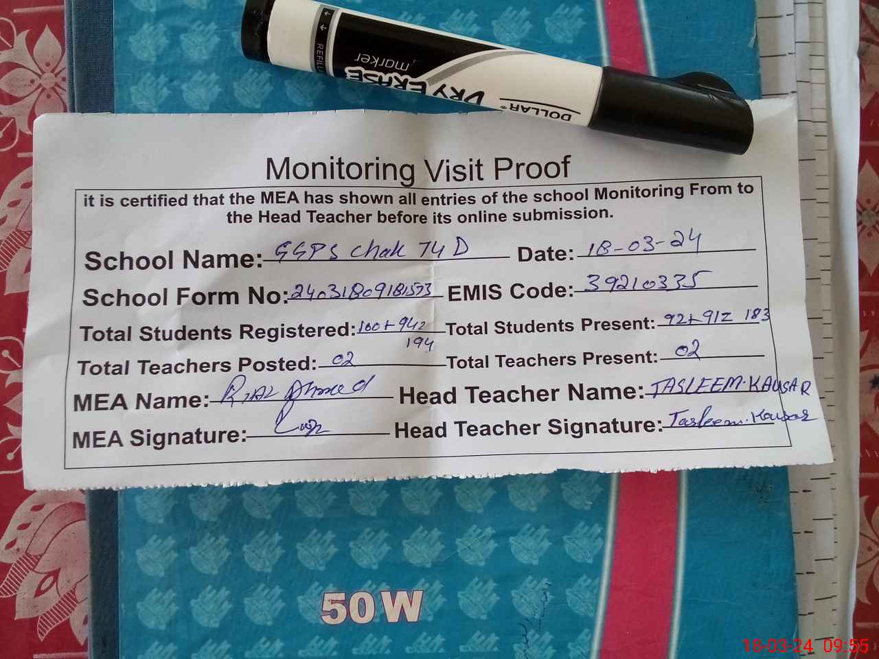 | Attendance Register | Head Teacher | MEA with School | Visit Proof |