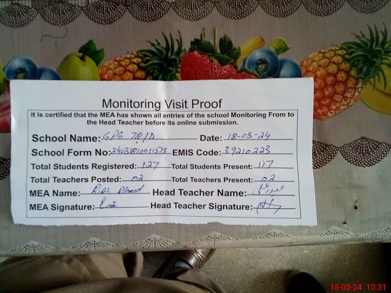 | Attendance Register | Head Teacher | MEA with School | Visit Proof |