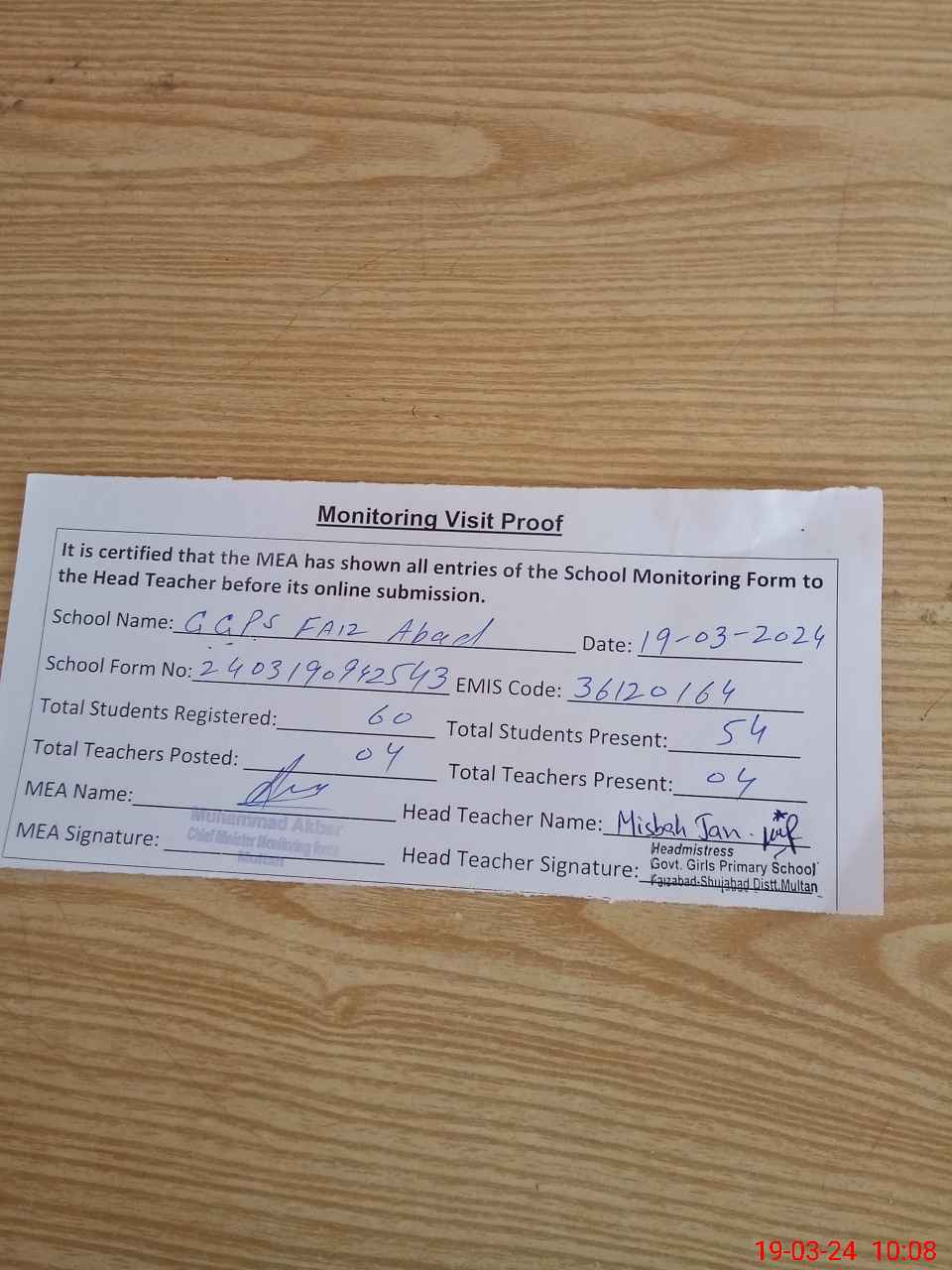 | Attendance Register | Head Teacher | MEA with School | Visit Proof |
