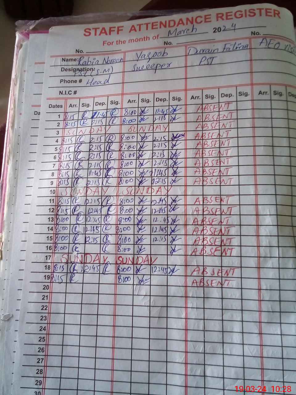 | CNIC | Full Name | Designation | R/C | Absence During Last Calender Month |