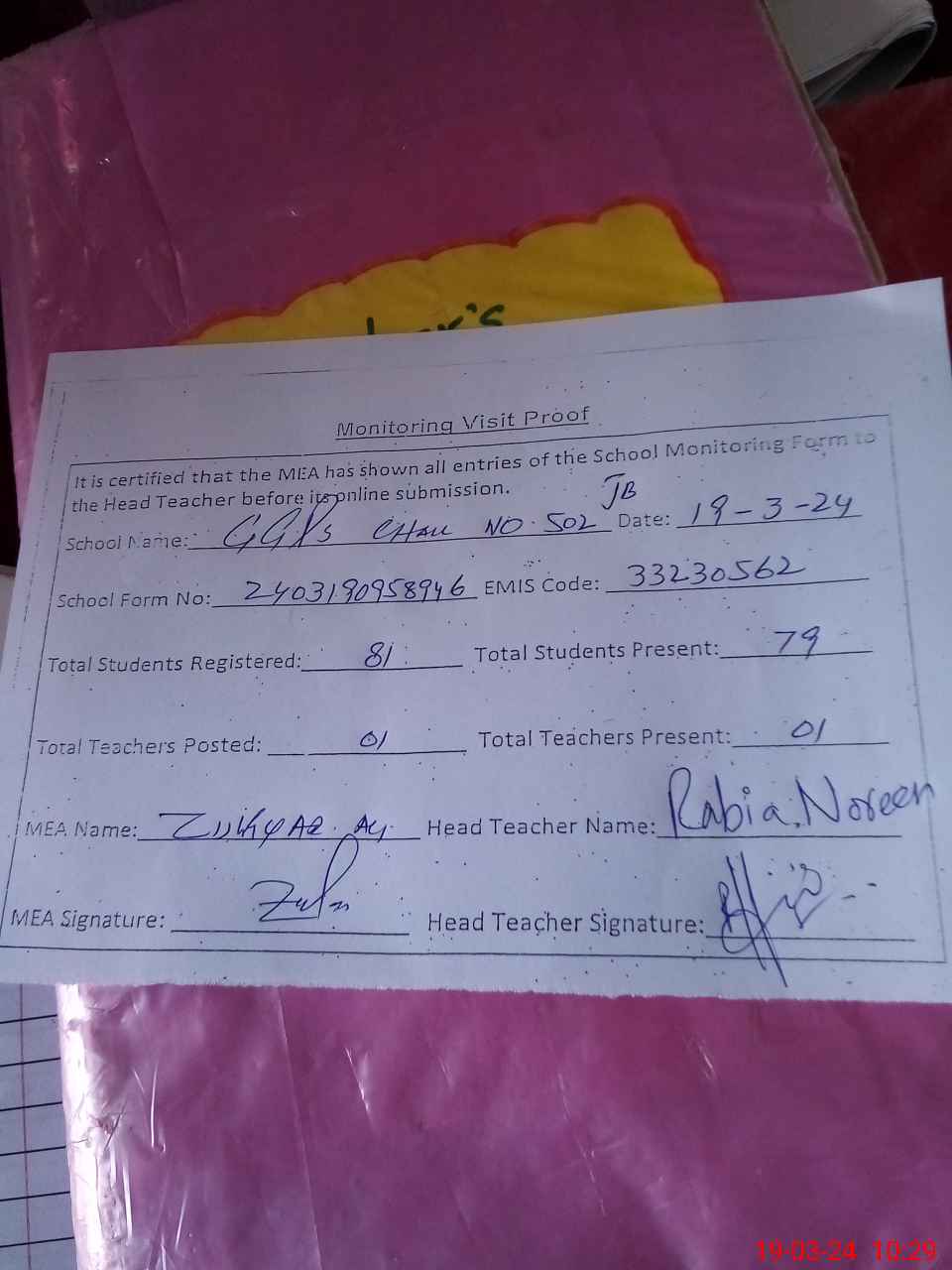 | Name: RA**** NO**** Designation: (School Headmaster's/Headmistress's) PST Phone/Cell Number: 03**** |