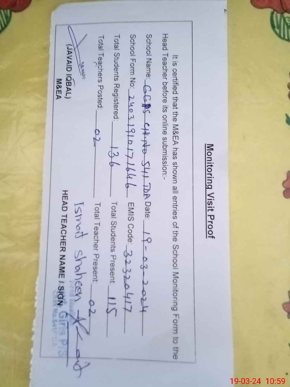 | Name: IS**** SH**** Designation: (School Headmaster's/Headmistress's) Ese Phone/Cell Number: 03**** |