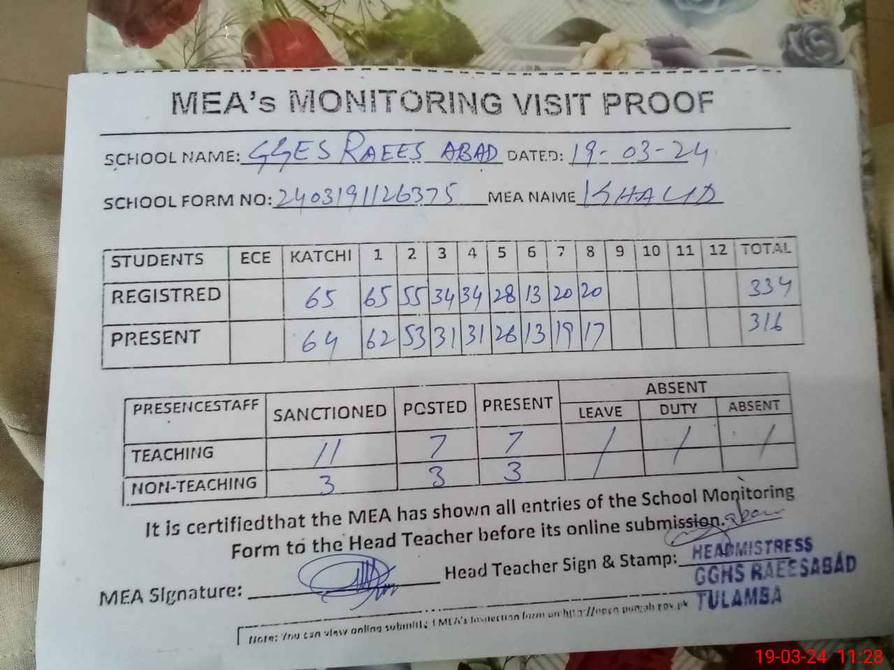 | Attendance Register | Head Teacher | MEA with School | Visit Proof |