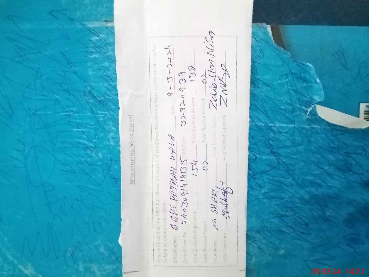 | Attendance Register | Head Teacher | MEA with School | Visit Proof |