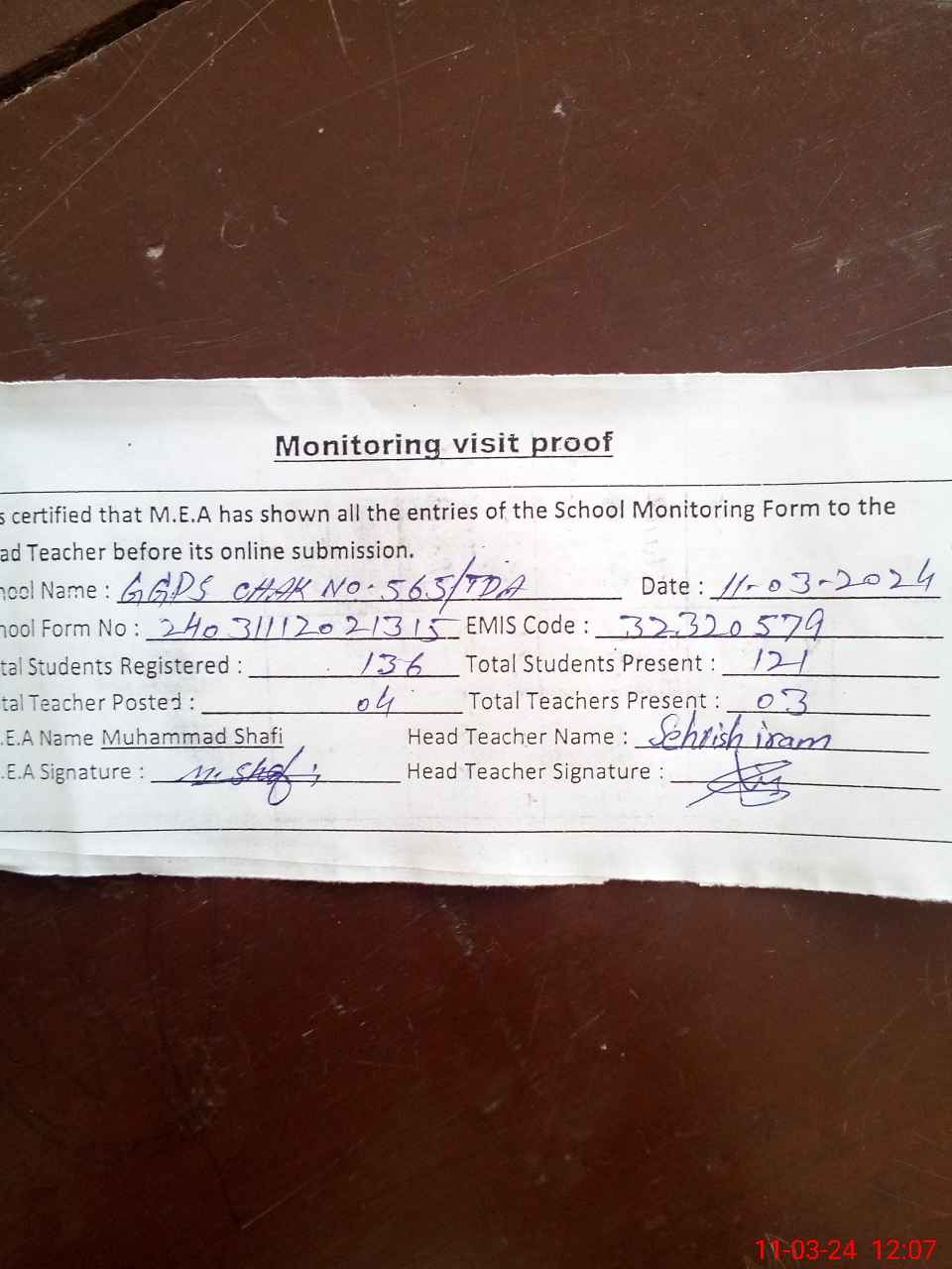 | EMIS Code: 32320579 | Name of School: GGPS CHAK NO. 565/TDA | |||