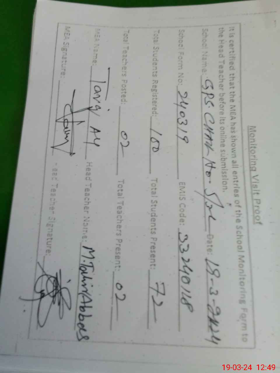 | Attendance Register | Head Teacher | MEA with School | Visit Proof |