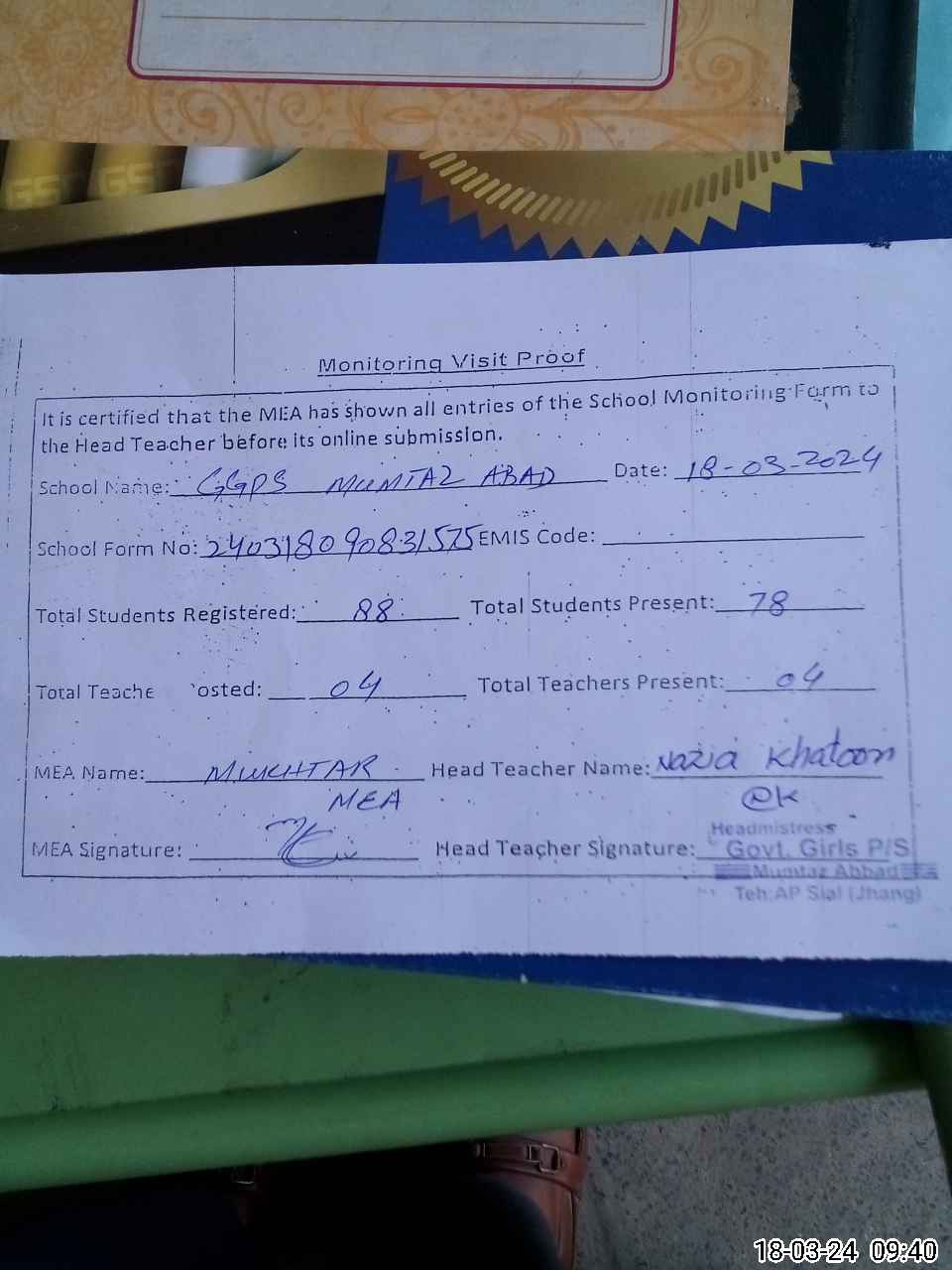 | EMIS Code: 33240391 | Name of School: GGPS MUMTAZ ABAD | |||