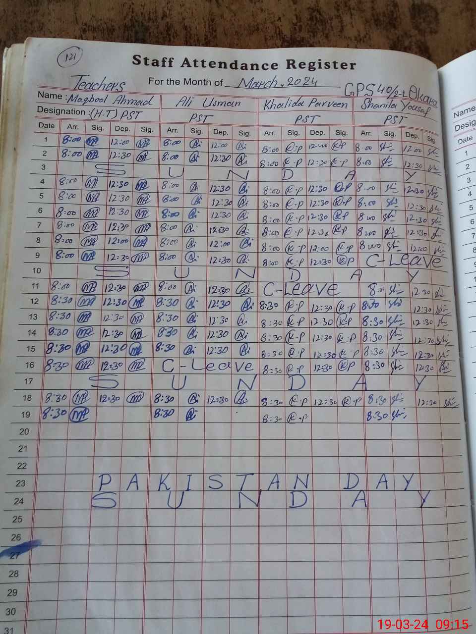 | CNIC | Full Name | Designation | R/C | Absence During Last Calender Month |