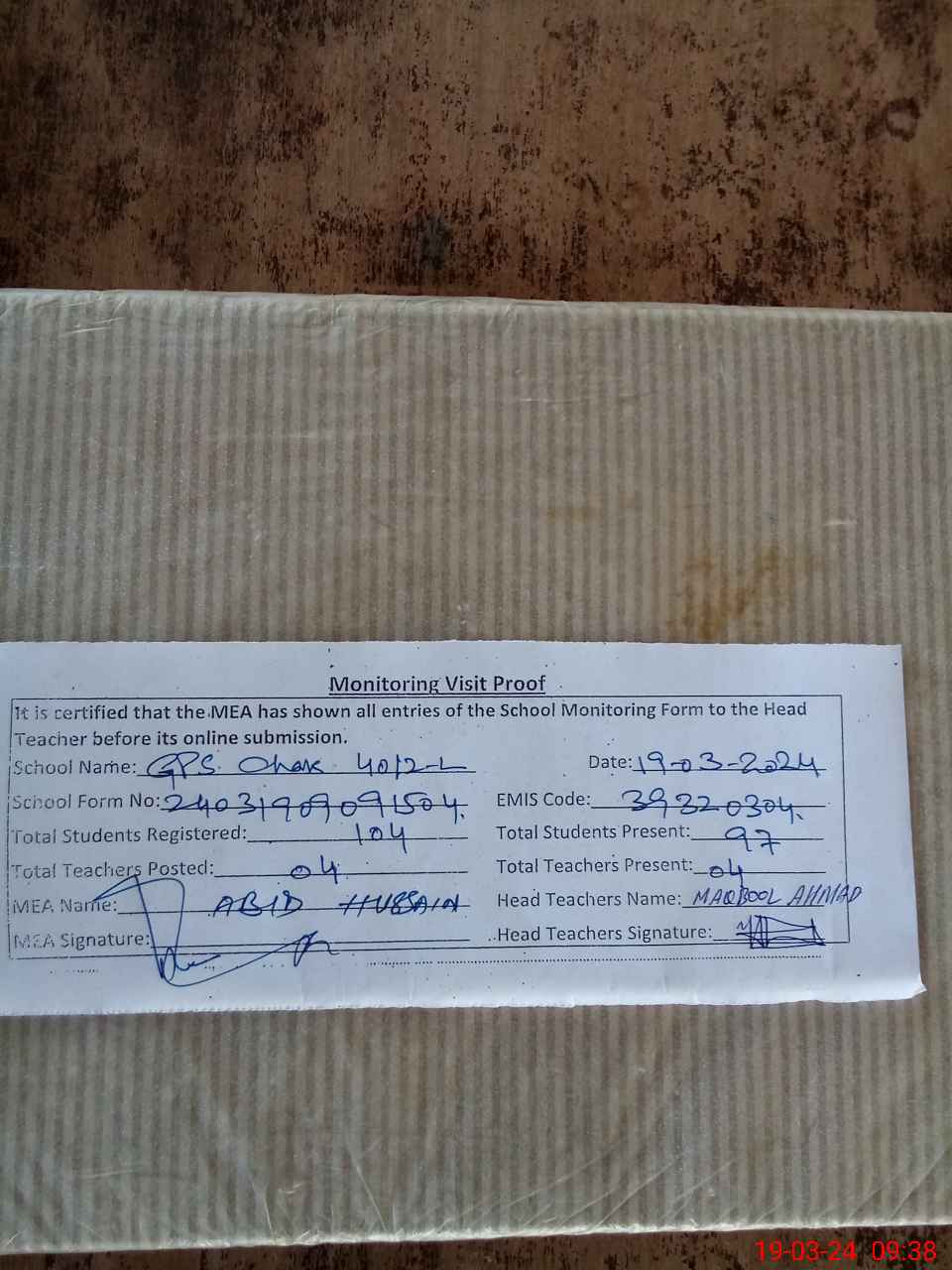 | Attendance Register | Head Teacher | MEA with School | Visit Proof |