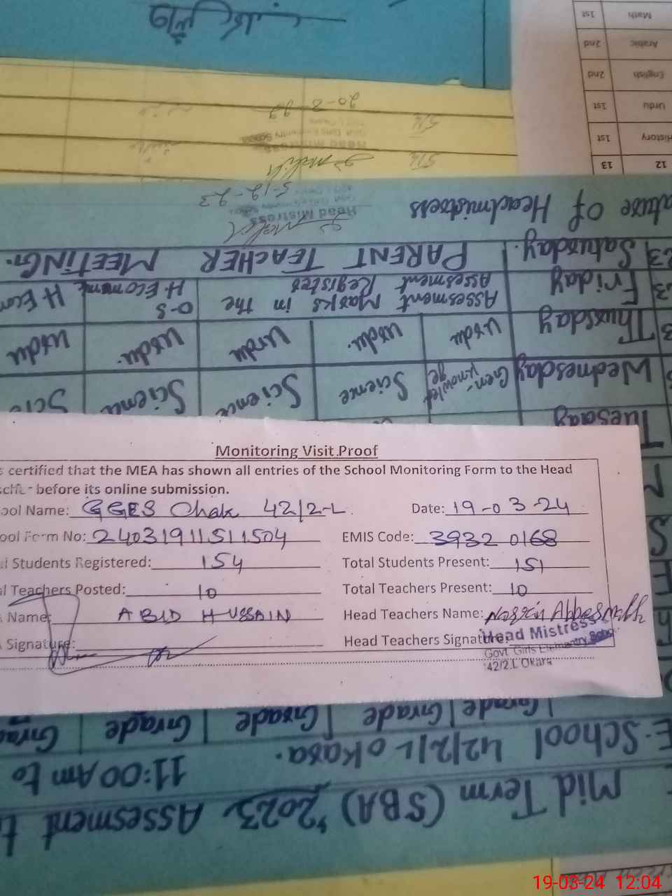 | Attendance Register | Head Teacher | MEA with School | Visit Proof |