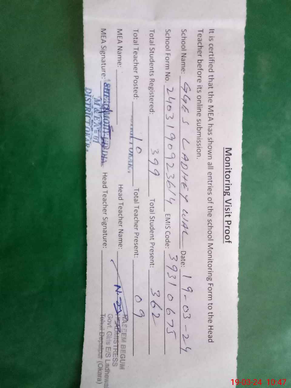 | Certified that this School was Inspected by the Undersigned MEA/DMO Today and the Information Stated Above is as Per Record. | |||||