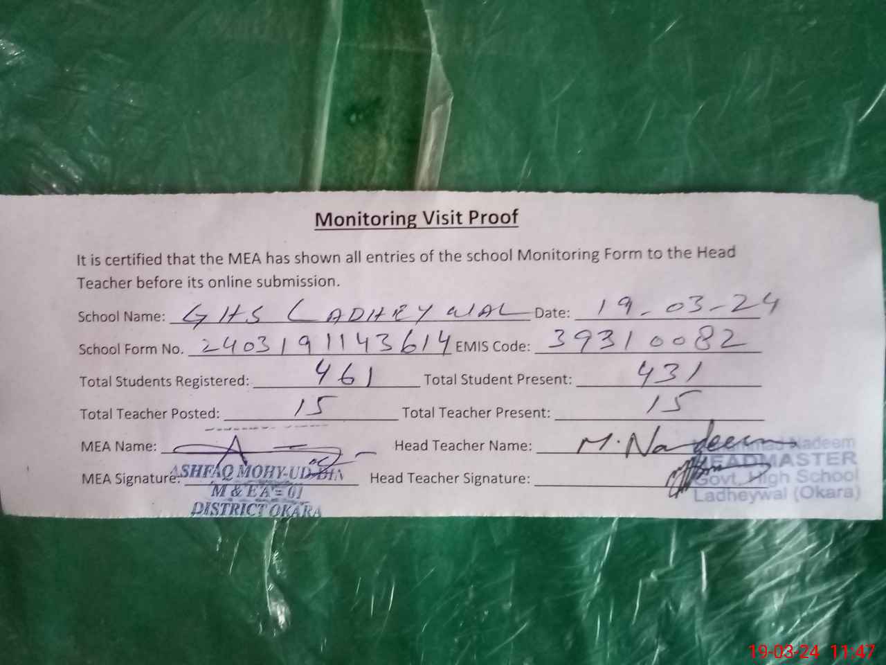 | Attendance Register | Head Teacher | MEA with School | Visit Proof |