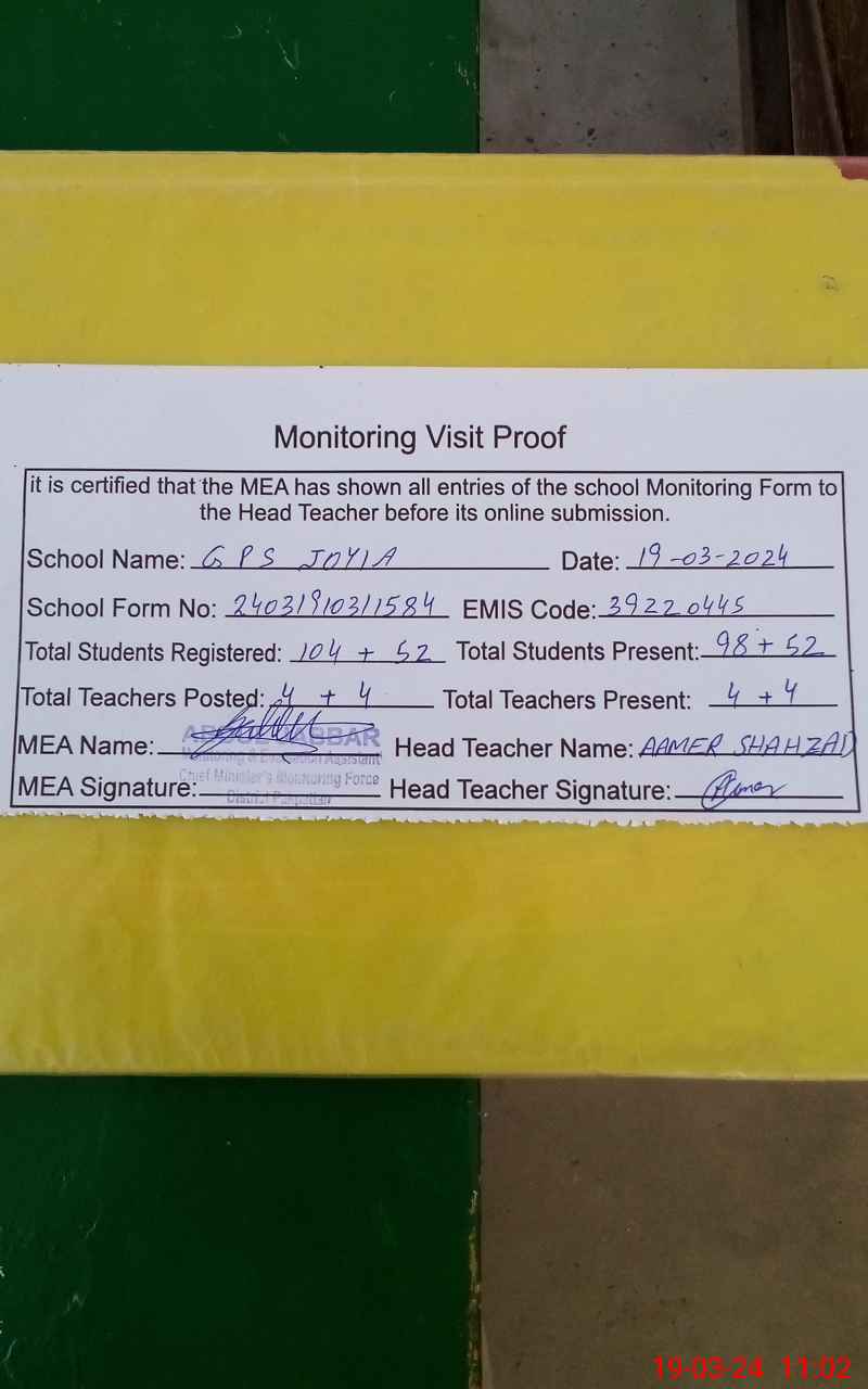 | EMIS Code: 39220445 | Name of School: GPS JOYIA P.O NOORA PATH ARIF WALA | |||