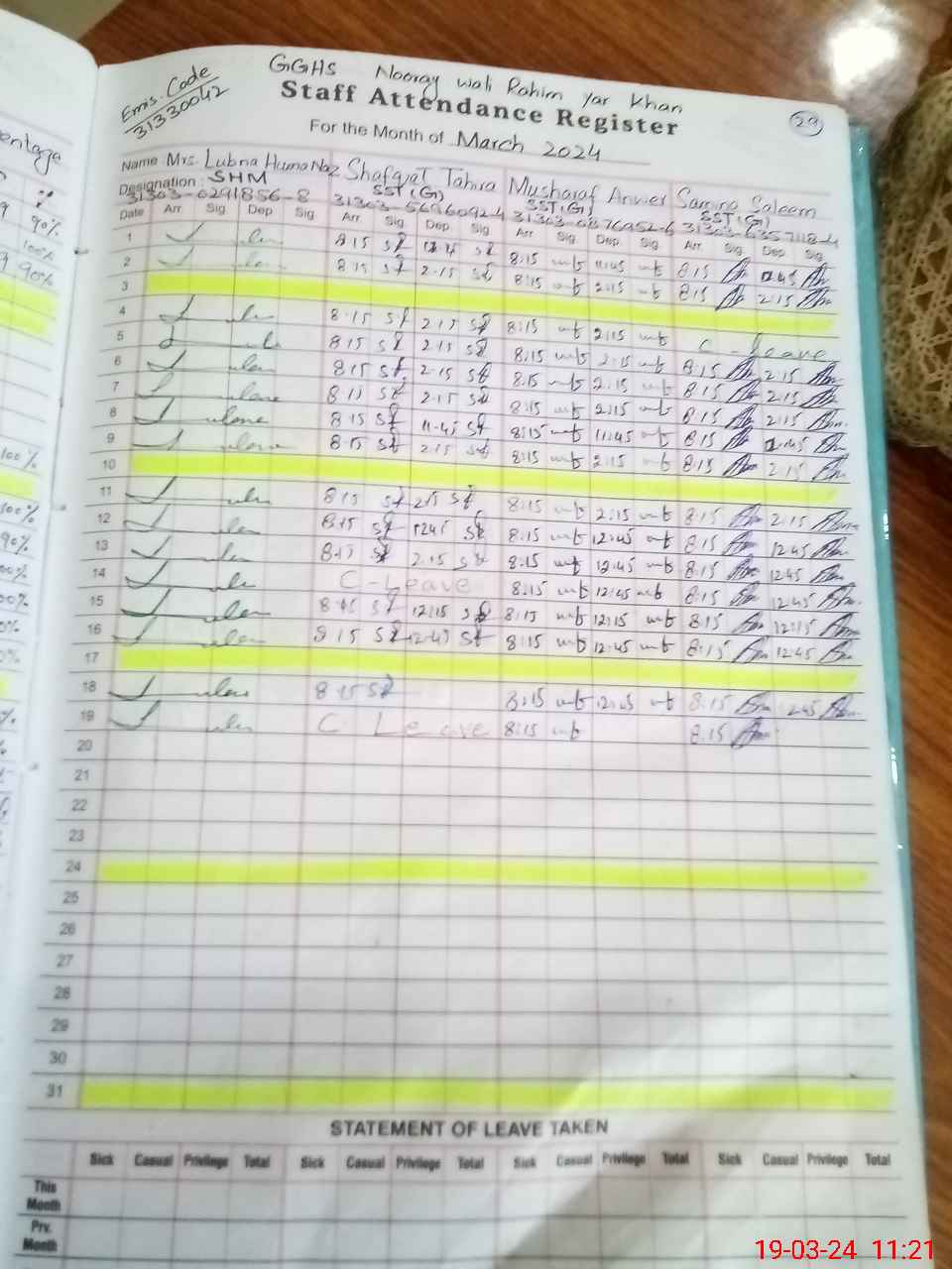 | CNIC | Full Name | Designation | R/C | Absence During Last Calender Month |