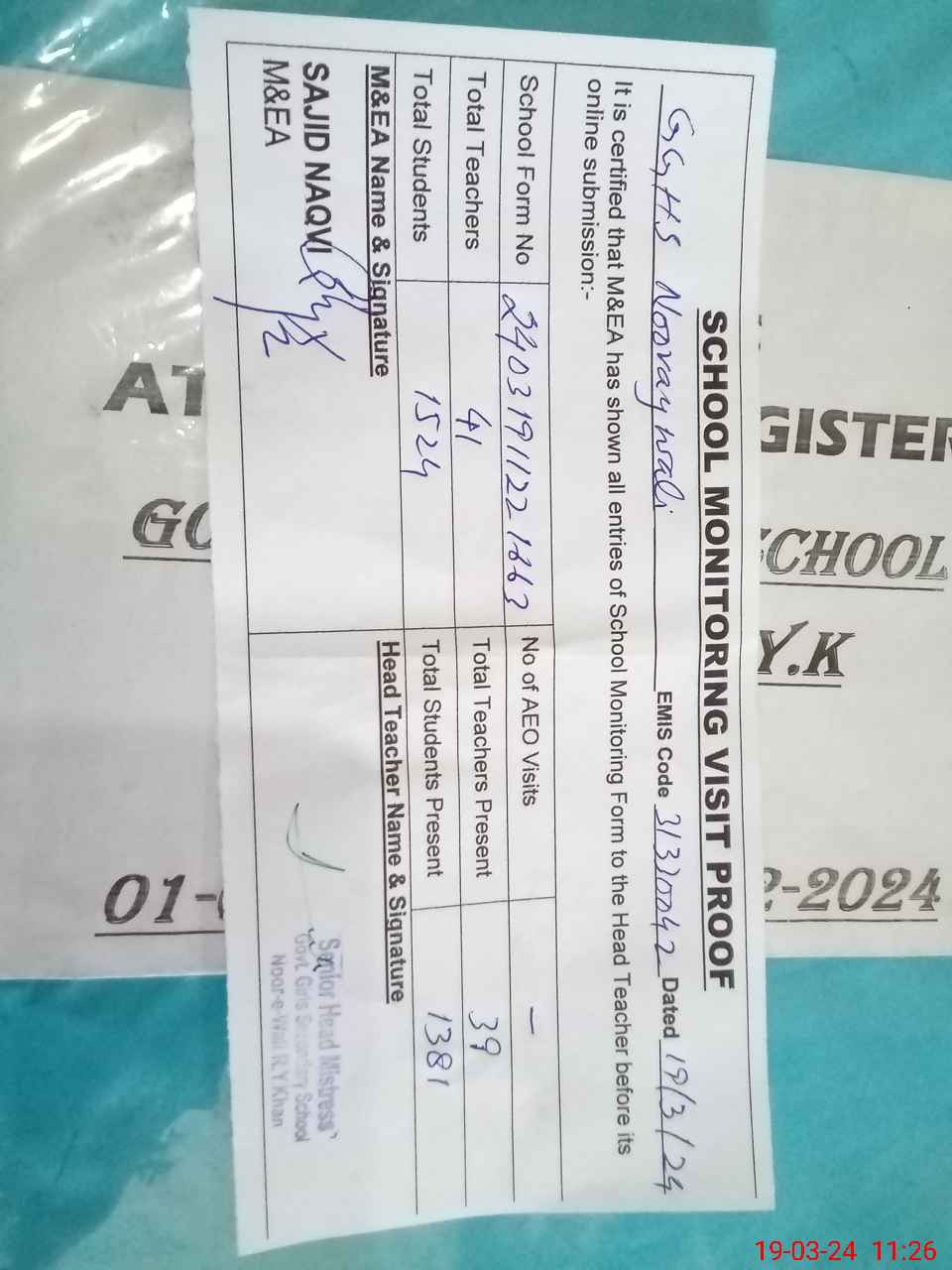 | Attendance Register | Head Teacher | MEA with School | Visit Proof |
