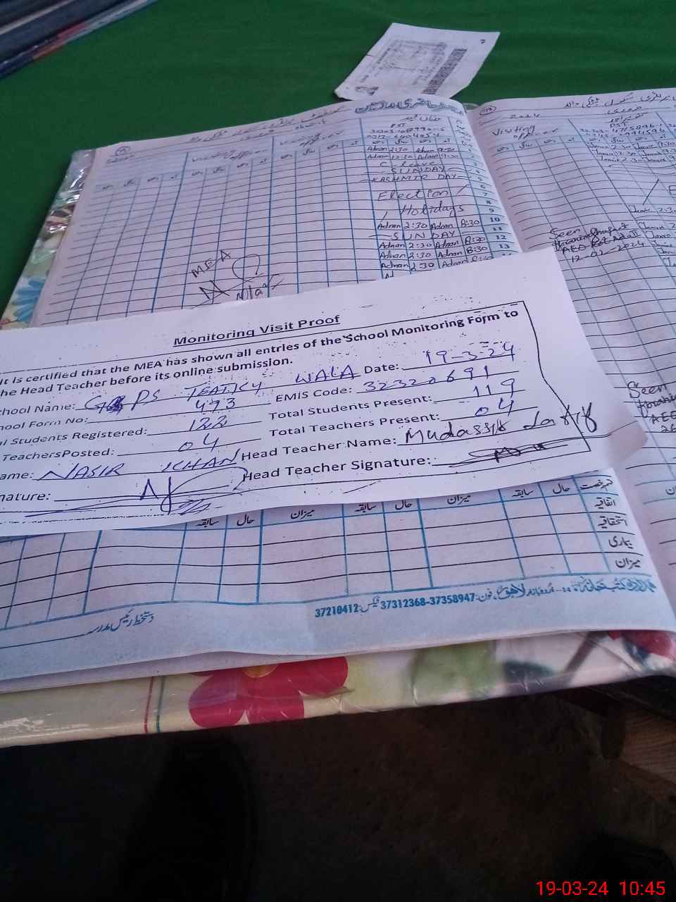 | Attendance Register | Head Teacher | MEA with School | Visit Proof |