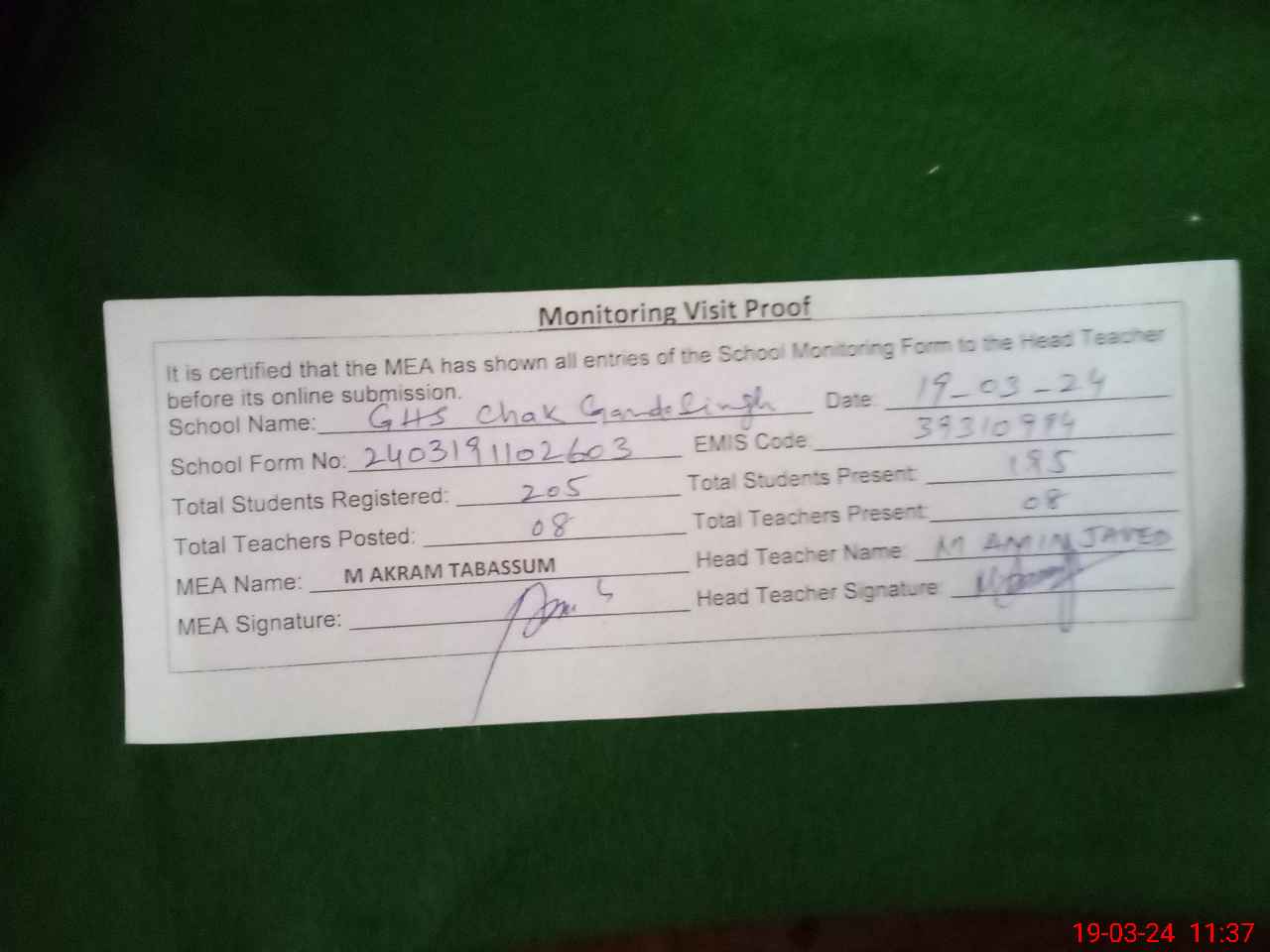 | Attendance Register | Head Teacher | MEA with School | Visit Proof |