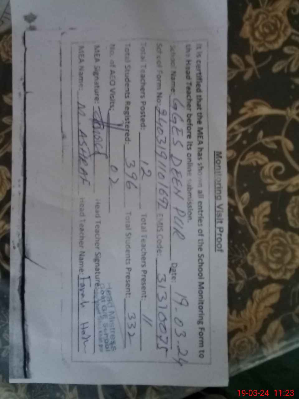 | Attendance Register | Head Teacher | MEA with School | Visit Proof |