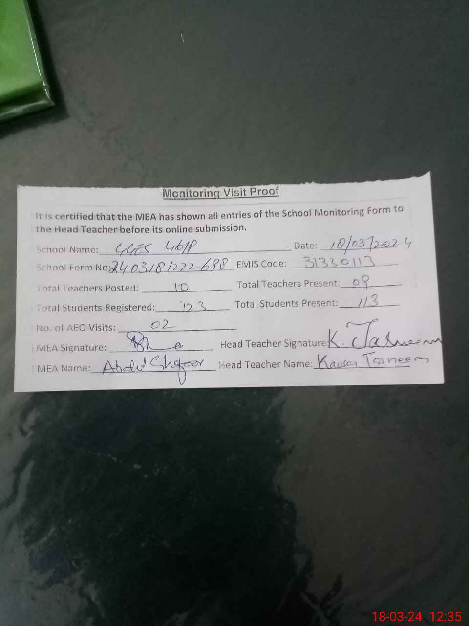 | Monitoring Date: 18-03-2024 | Start Time: 18-03-2024 12:05 PM | End Time: 18-03-2024 12:39 PM | Name of MEA: Ab**** Gh**** | |