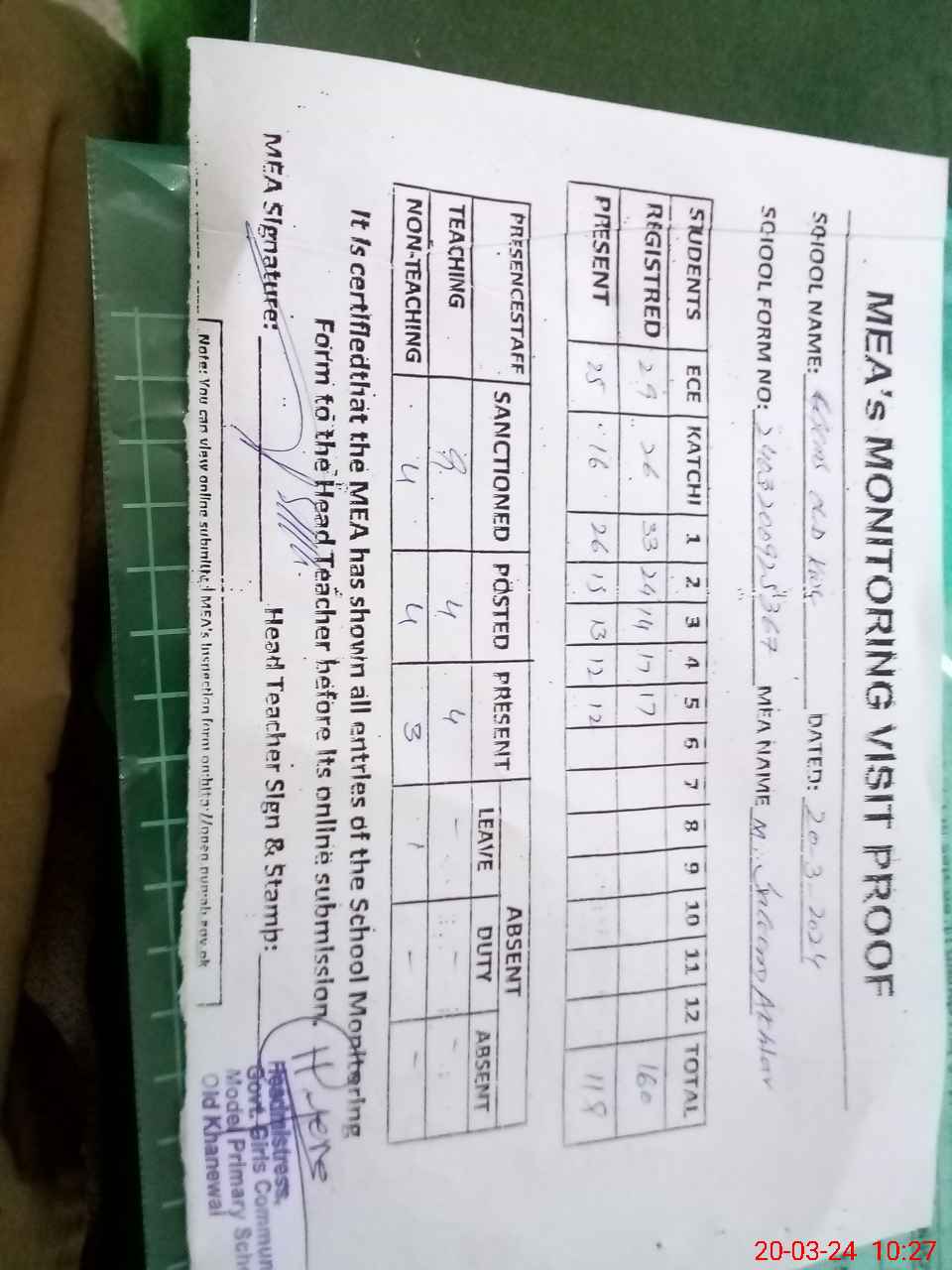 | Attendance Register | Head Teacher | MEA with School | Visit Proof |