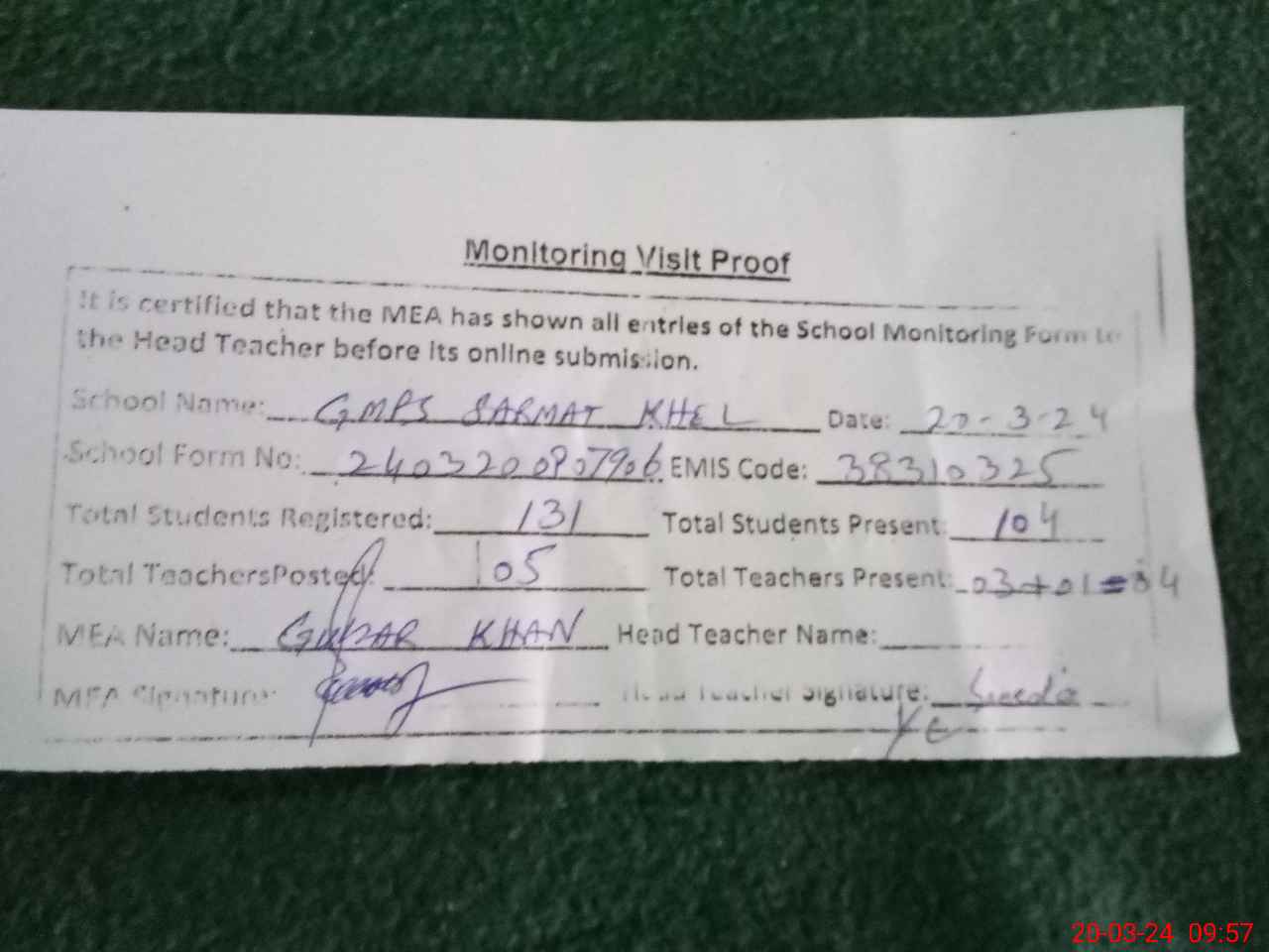 | Attendance Register | Head Teacher | MEA with School | Visit Proof |