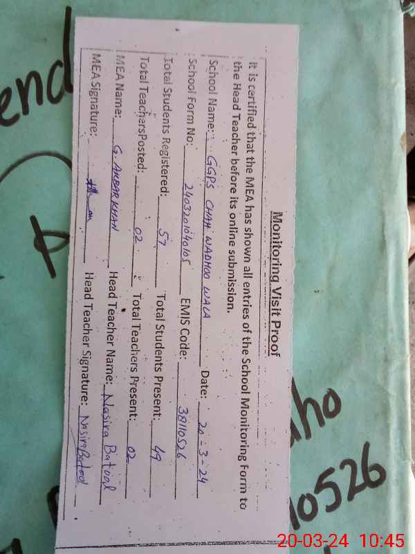 | EMIS Code: 38110526 | Name of School: GGPS CHAH WADHOO WALA | |||