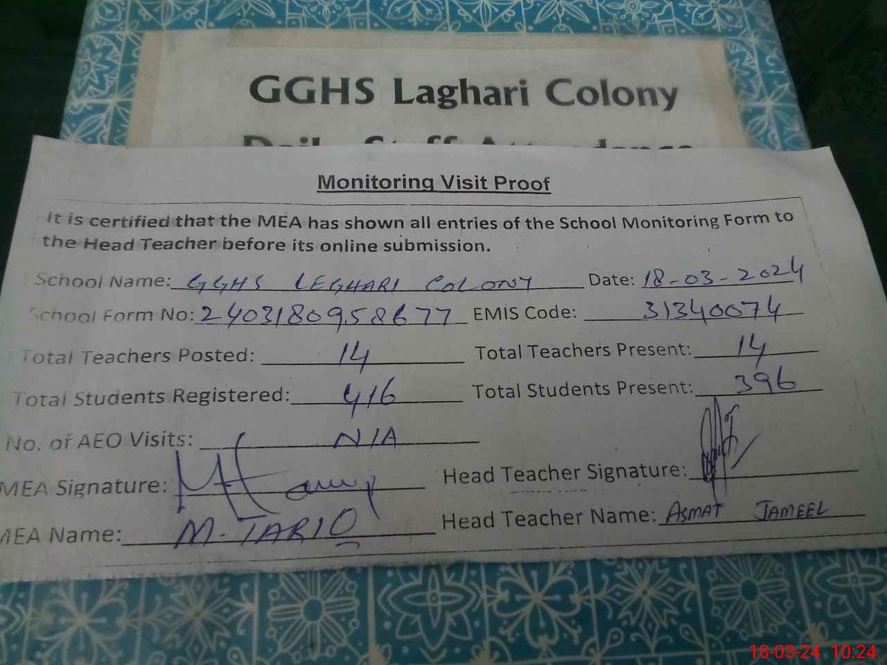 | EMIS Code: 31340074 | Name of School: GGHS LEGHARI COLONY | |||