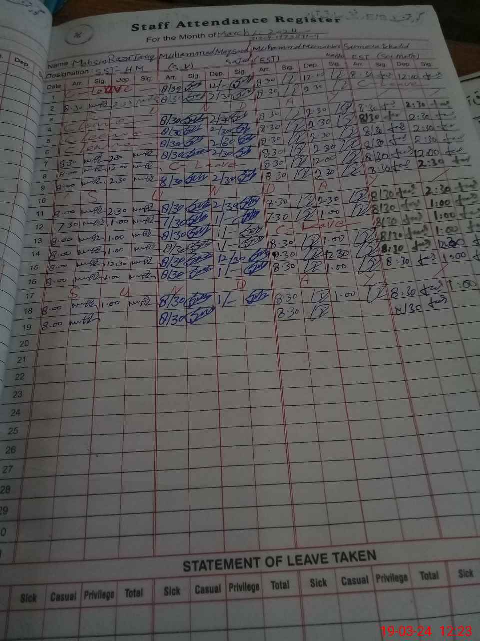 | CNIC | Full Name | Designation | R/C | Absence During Last Calender Month |