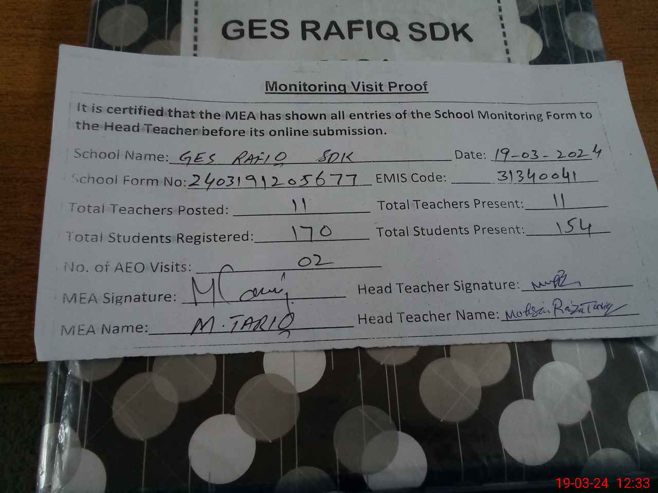 | Attendance Register | Head Teacher | MEA with School | Visit Proof |