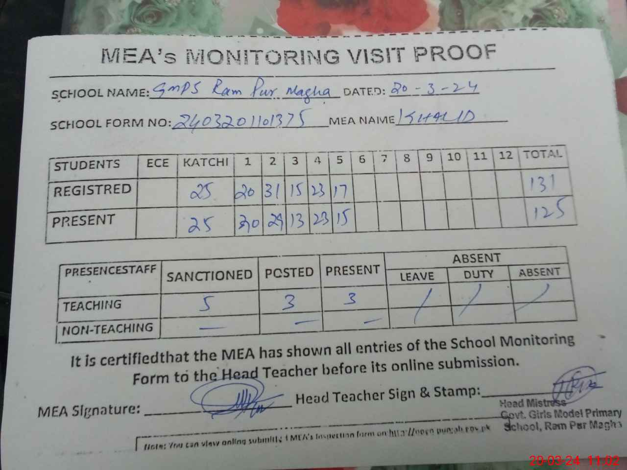 | EMIS Code: 36430399 | Name of School: GMPS RAM PUR MAGHA, TULAMBA | |||