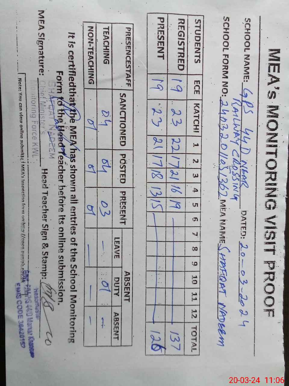 | Attendance Register | Head Teacher | MEA with School | Visit Proof |