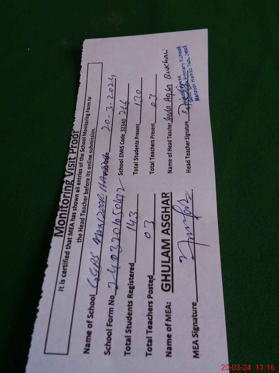 | Attendance Register | Head Teacher | MEA with School | Visit Proof |