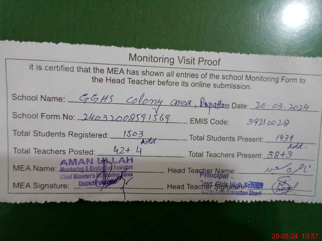 | Attendance Register | Head Teacher | MEA with School | Visit Proof |