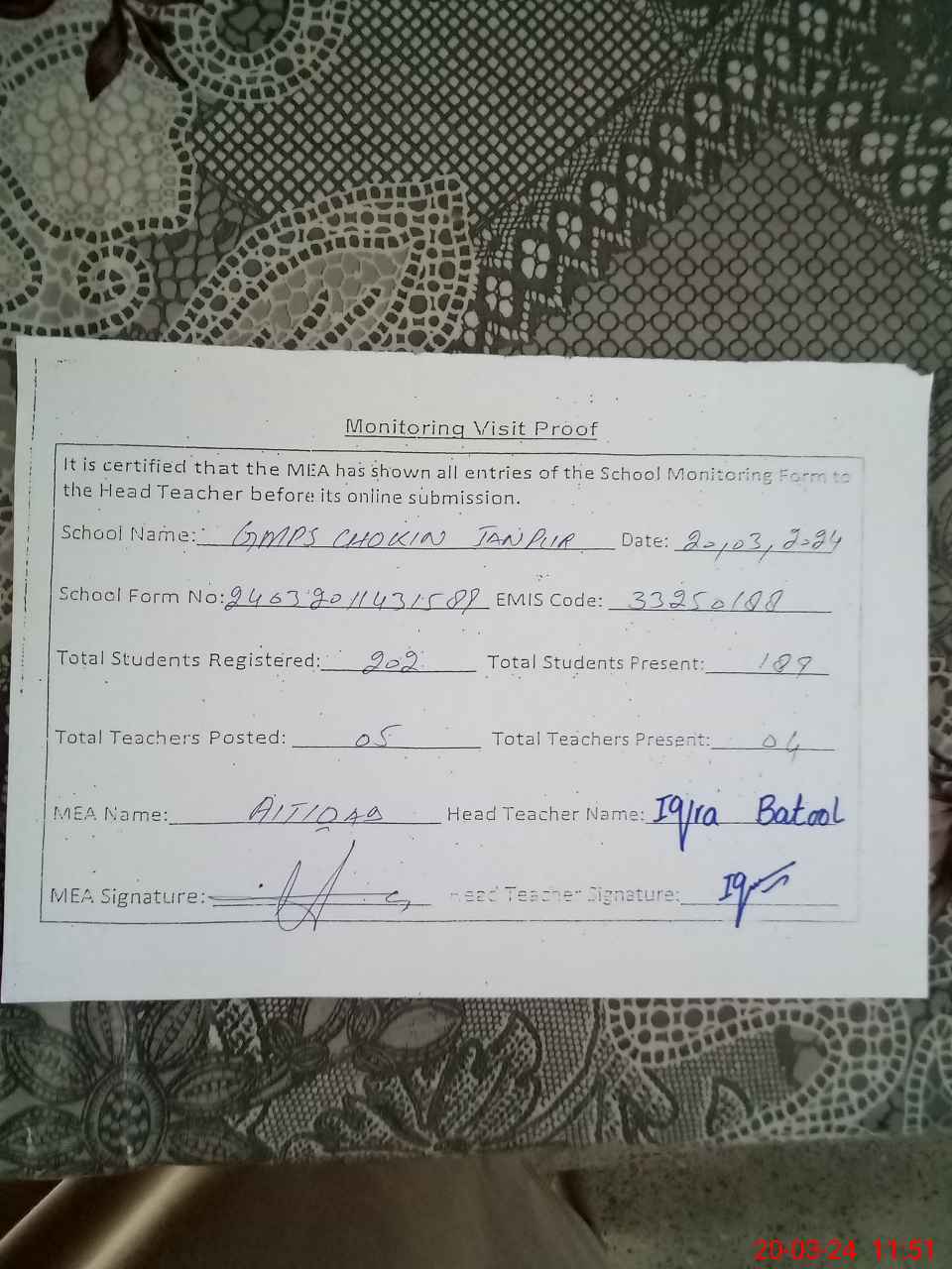 | EMIS Code: 33250188 | Name of School: GMPS CHOKIN JAN PUR | |||