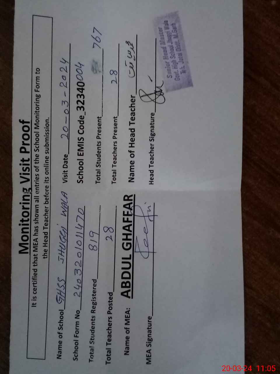 | Attendance Register | Head Teacher | MEA with School | Visit Proof |
