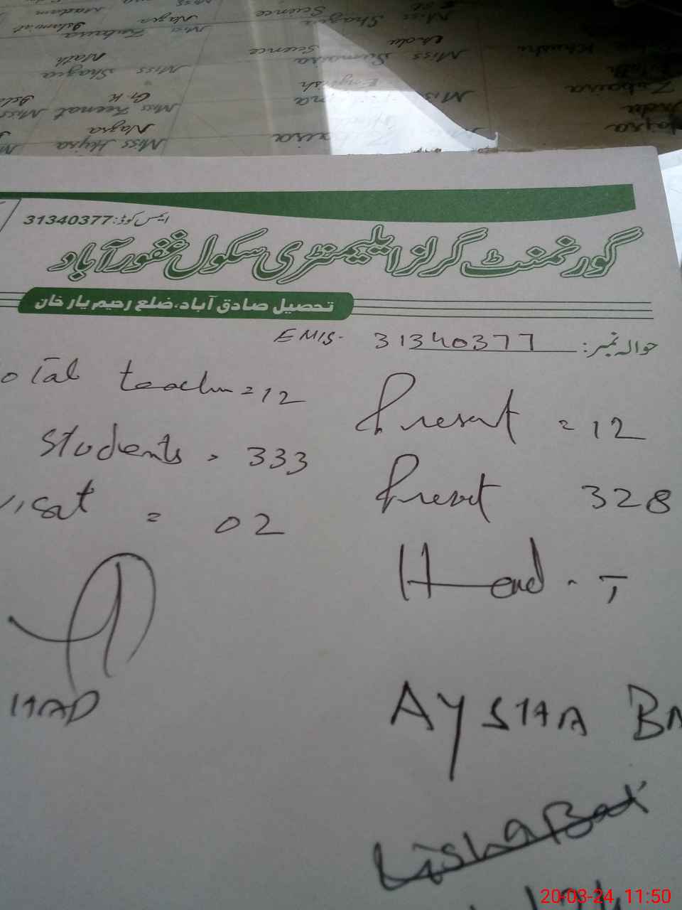 | Name: Ay**** Ba**** Designation: (School Headmaster's/Headmistress's) EST Phone/Cell Number: 03**** |