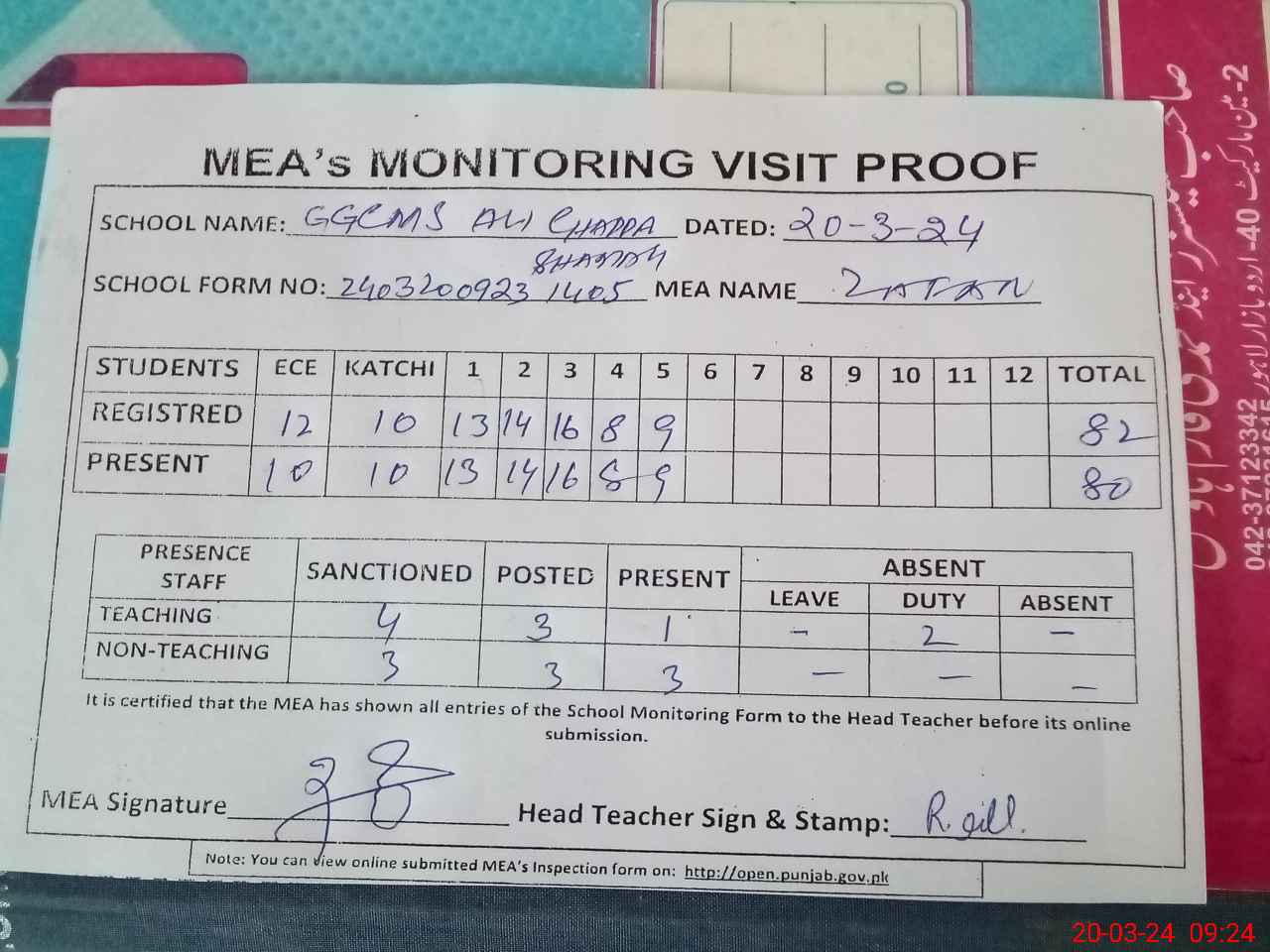| Attendance Register | Head Teacher | MEA with School | Visit Proof |