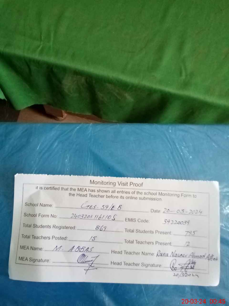 | Certified that this School was Inspected by the Undersigned MEA/DMO Today and the Information Stated Above is as Per Record. | |||||